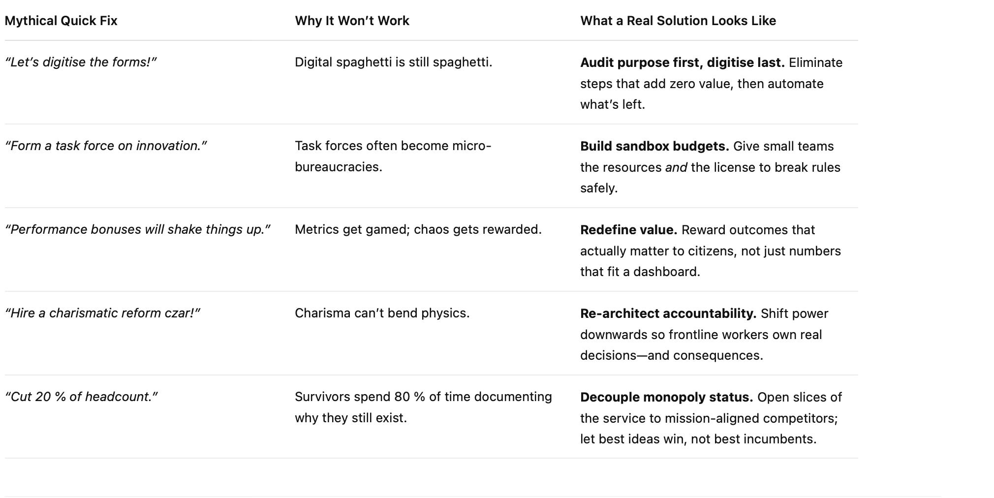 Bureaucracy’s slide from clockwork to clown car isn’t a glitch—it’s the default setting when well-meaning humans keep layering rules on rules. Pretending a couple of brainstorming sessions will fix it is like duct-taping wings onto a bus and calling it an airplane.