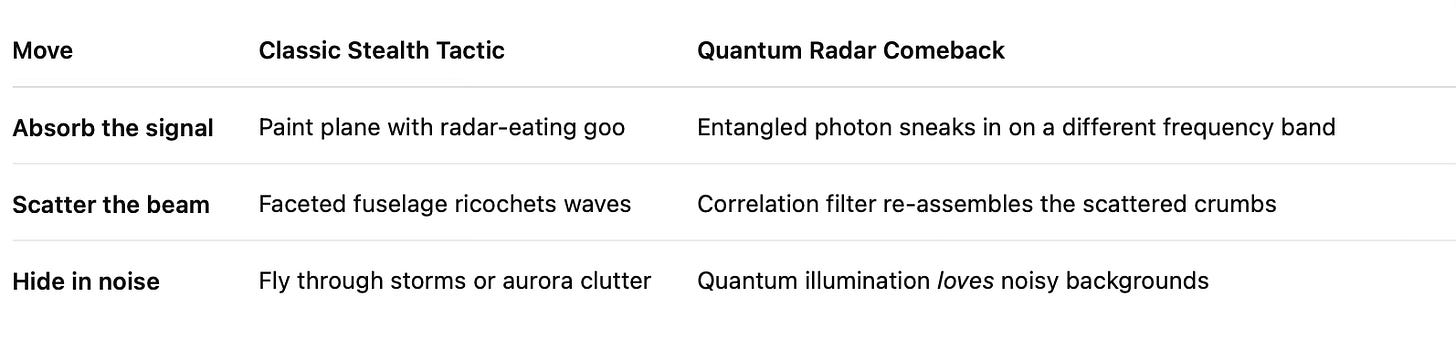 Stealth aircraft thought they’d RSVP’d to the physics party wearing perfect camouflage. Quantum radar showed up with entangled glow-sticks, turned on the cosmic black-light, and yelled, “Nice paint job—shame about the fluorescent footprints!”