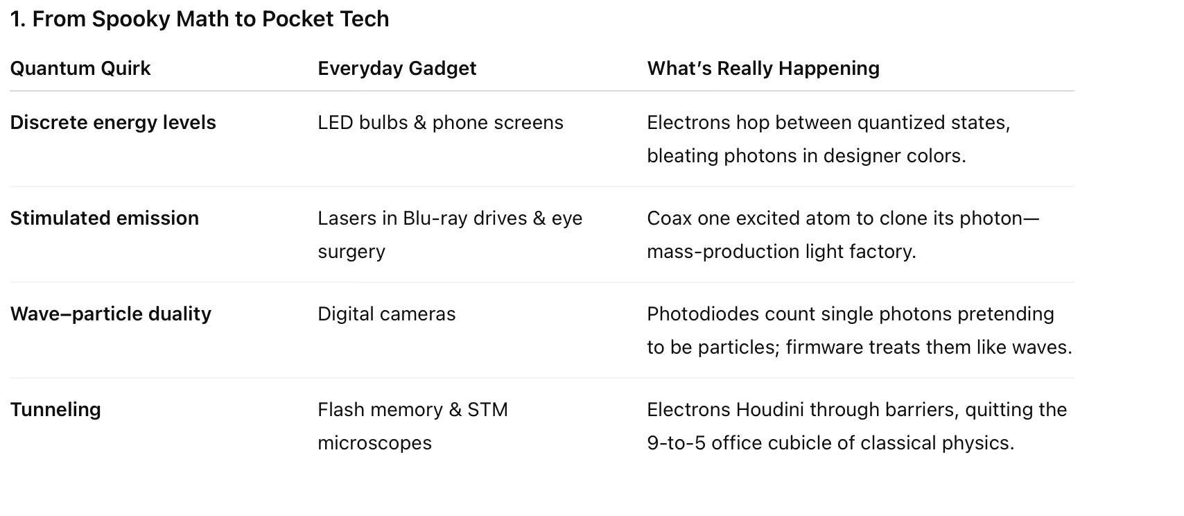 Every time your phone pings, a quantum trick plays backstage: electrons tunneling, photons lasering, atoms time-stamping. And the dev team (nature) still won’t publish full documentation.